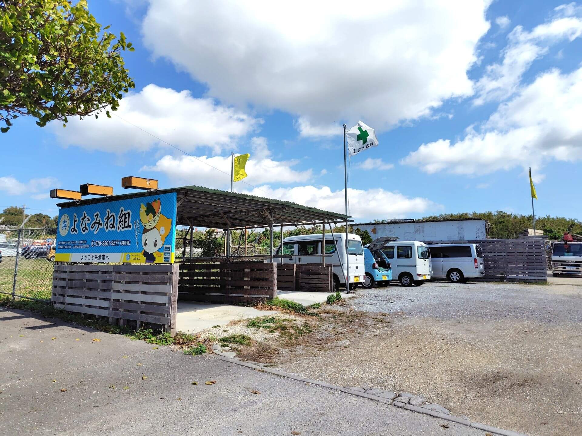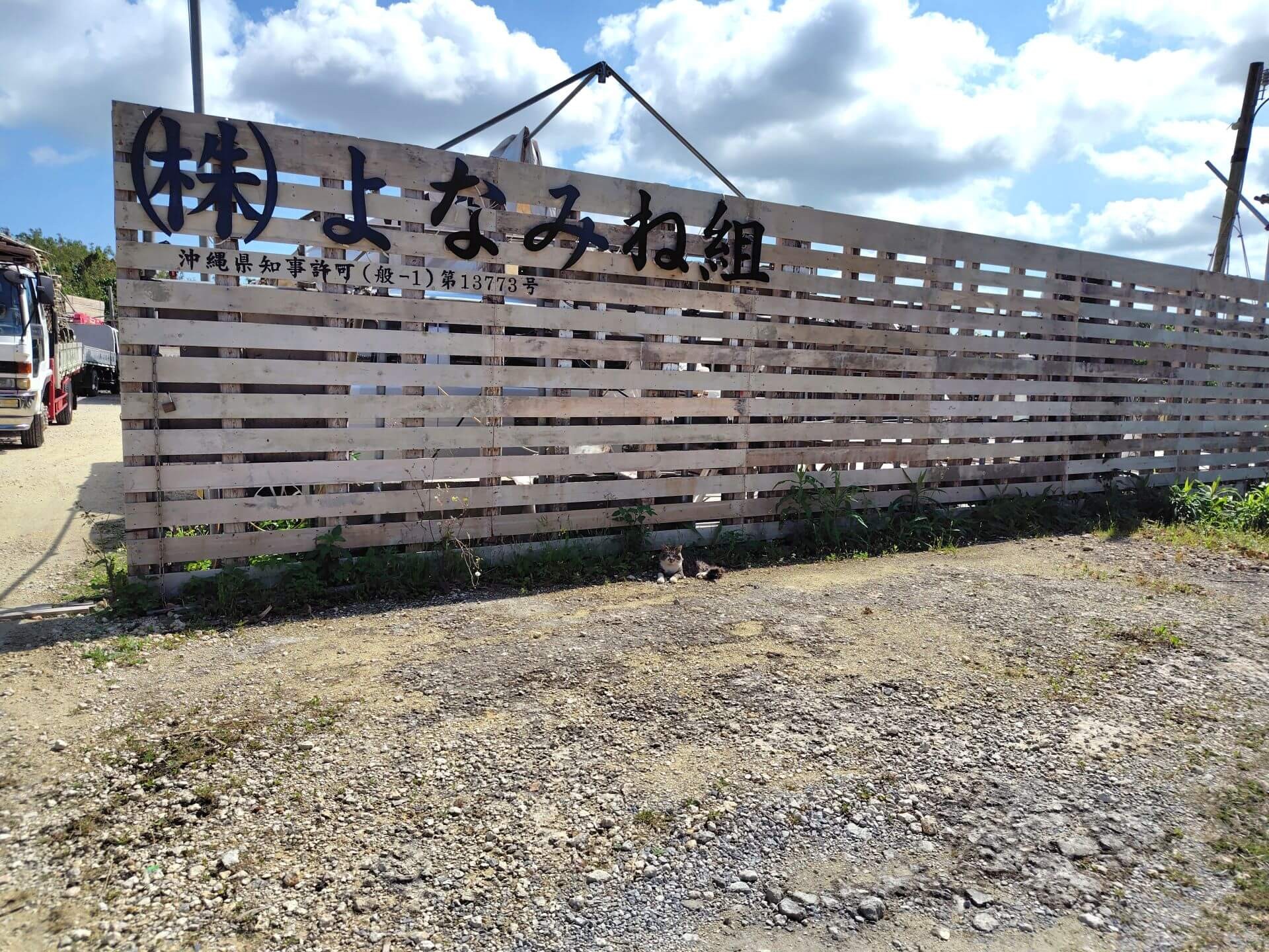広いヤードに資材・ユニック車が並ぶ