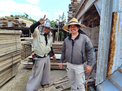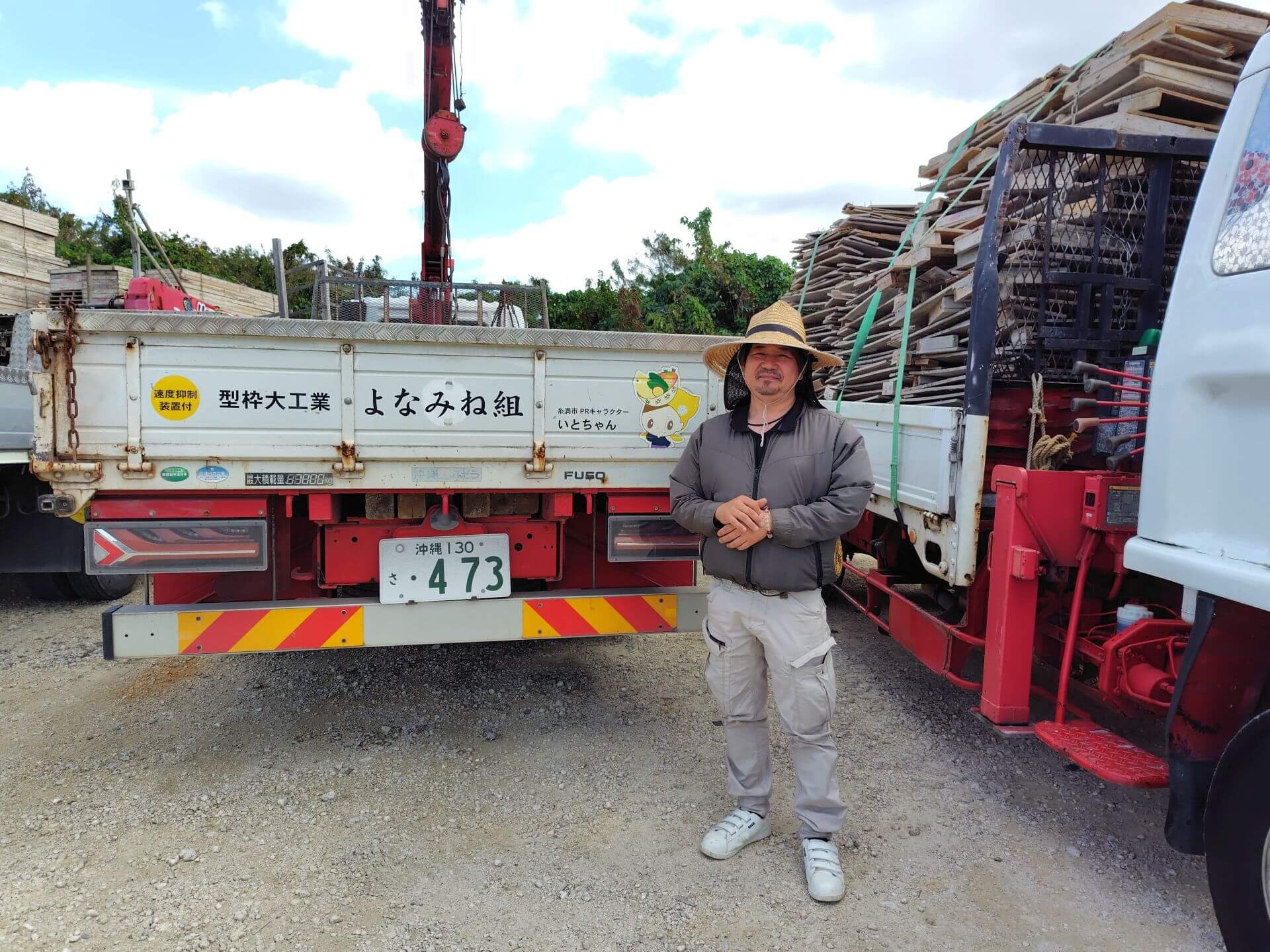 麦わら帽で資材を運ぶ気さくな社長 |